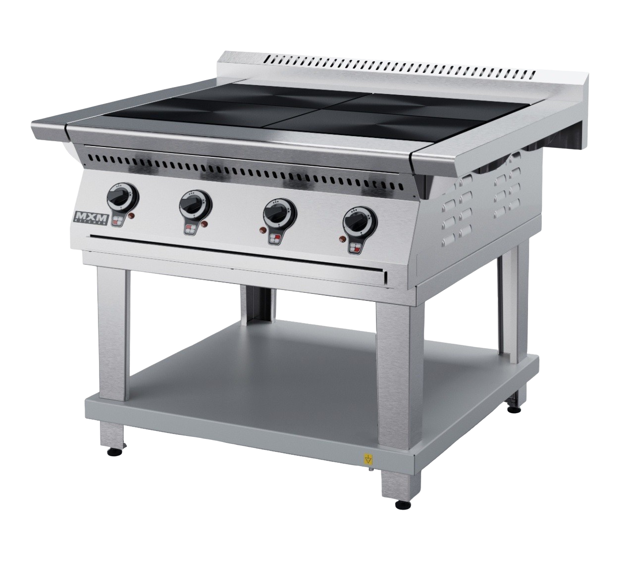 Размеры 840х850х860 мм, , лицевая часть ,подставка и боковины из нержавеющей стали, 4 чугунные конфорки, мощность 3 кВт, площадь одной конфорки 0,12 м, 3 режима регулировки мощности