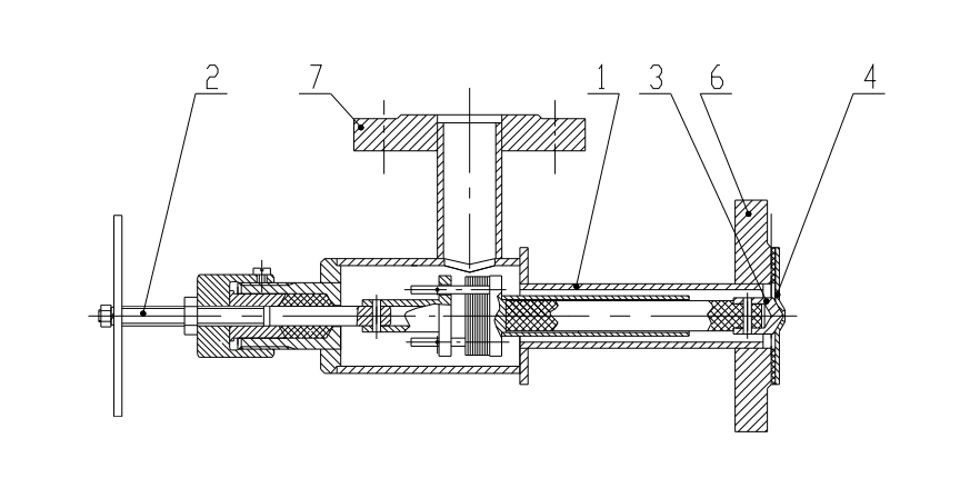 Конденсатоотводчик состоит из корпуса (1) с встроенным седлом (4) и с присоединительными фланцами (6,7), настроечного винта (2). Внутри корпуса смонтированы термочувствительный клапанный блок (3) с пакетом биметаллических пластин и плоских пружин.